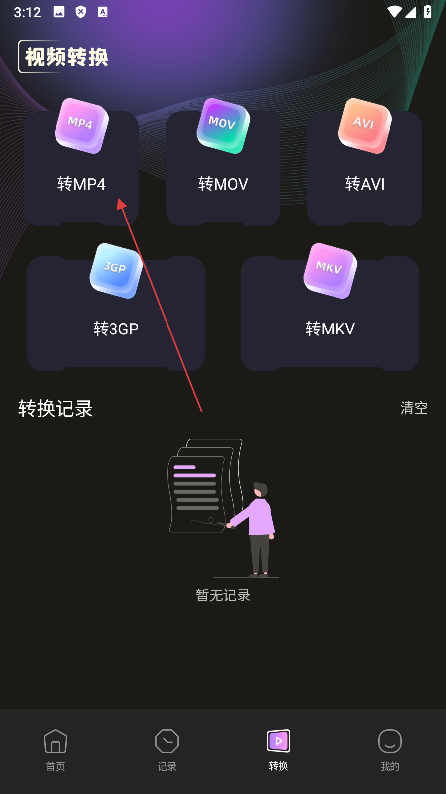 2、在视频转换页面,点击【转MP4】,进入选择视频页面。