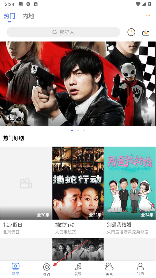 1、在影院页面,点击底部【热点】,进入热点影视页面。