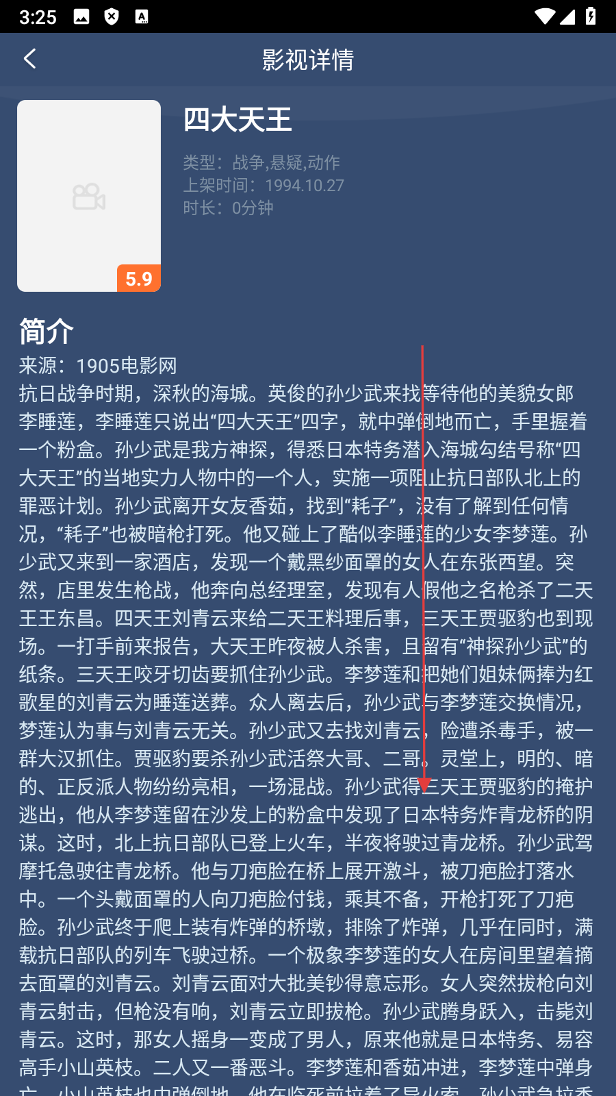 3、在影视详情页面,可查看该影视的简介,然后【向下滑动】。