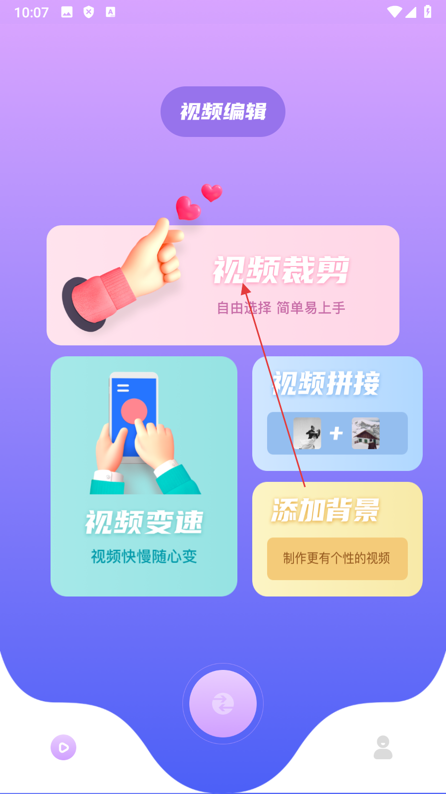 2、在视频编辑功能页面,点击【视频裁剪】,进入选择视频页面。