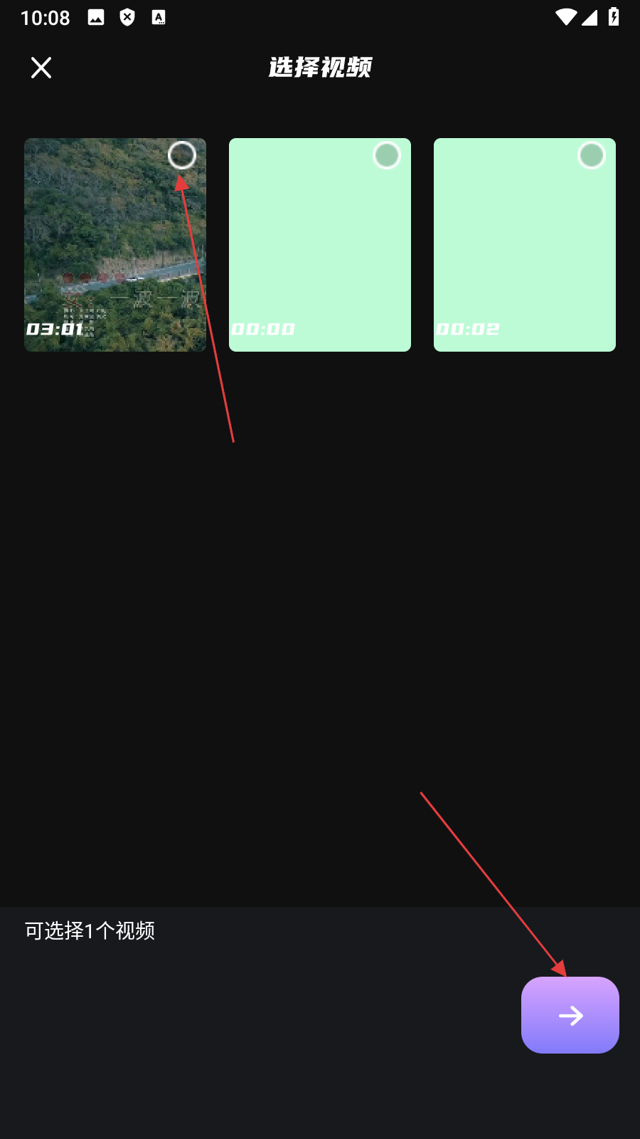 3、在选择视频页面,选择【要裁剪的视频】后点击【箭头按钮】,进入视频裁剪页面。
