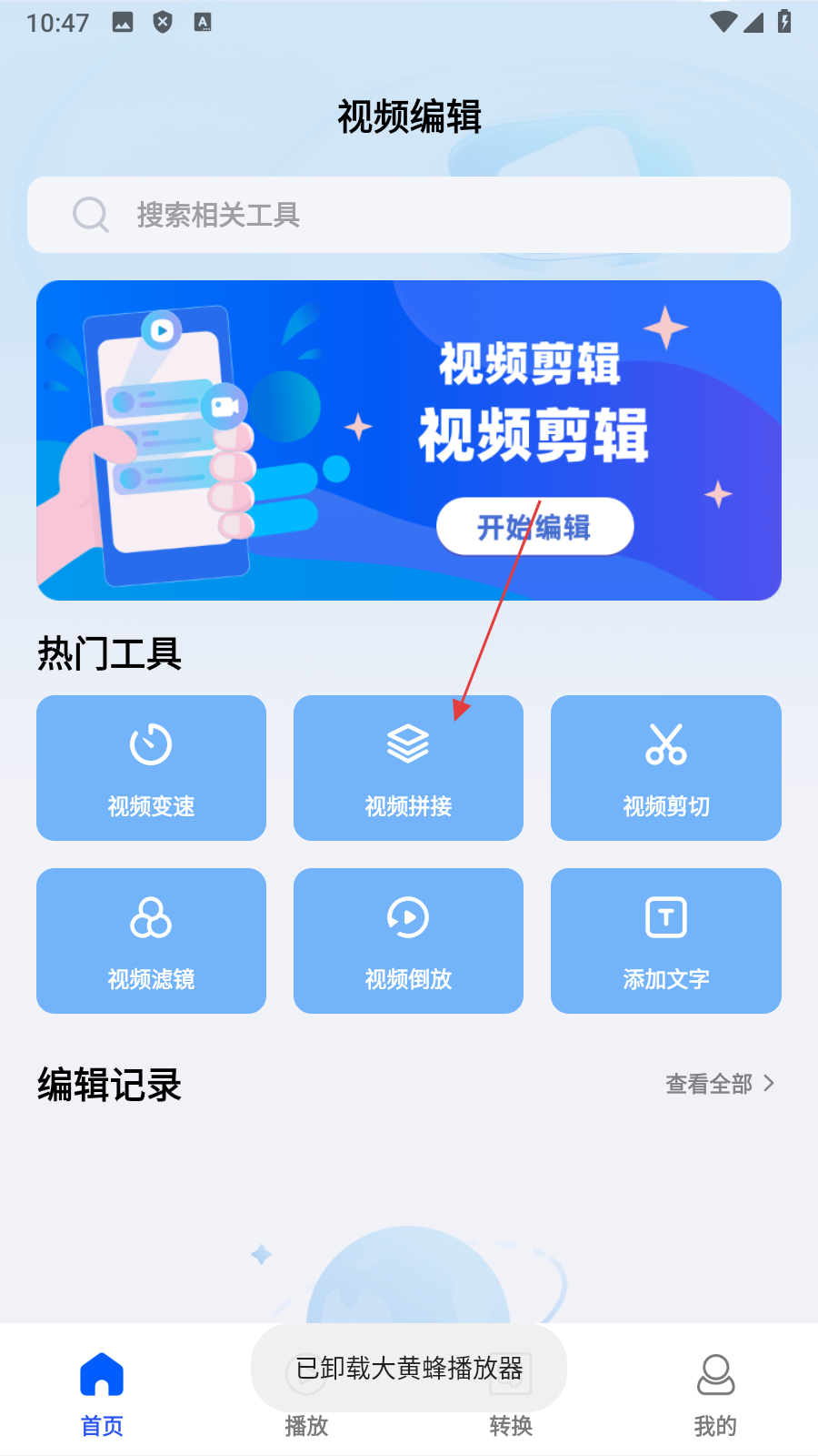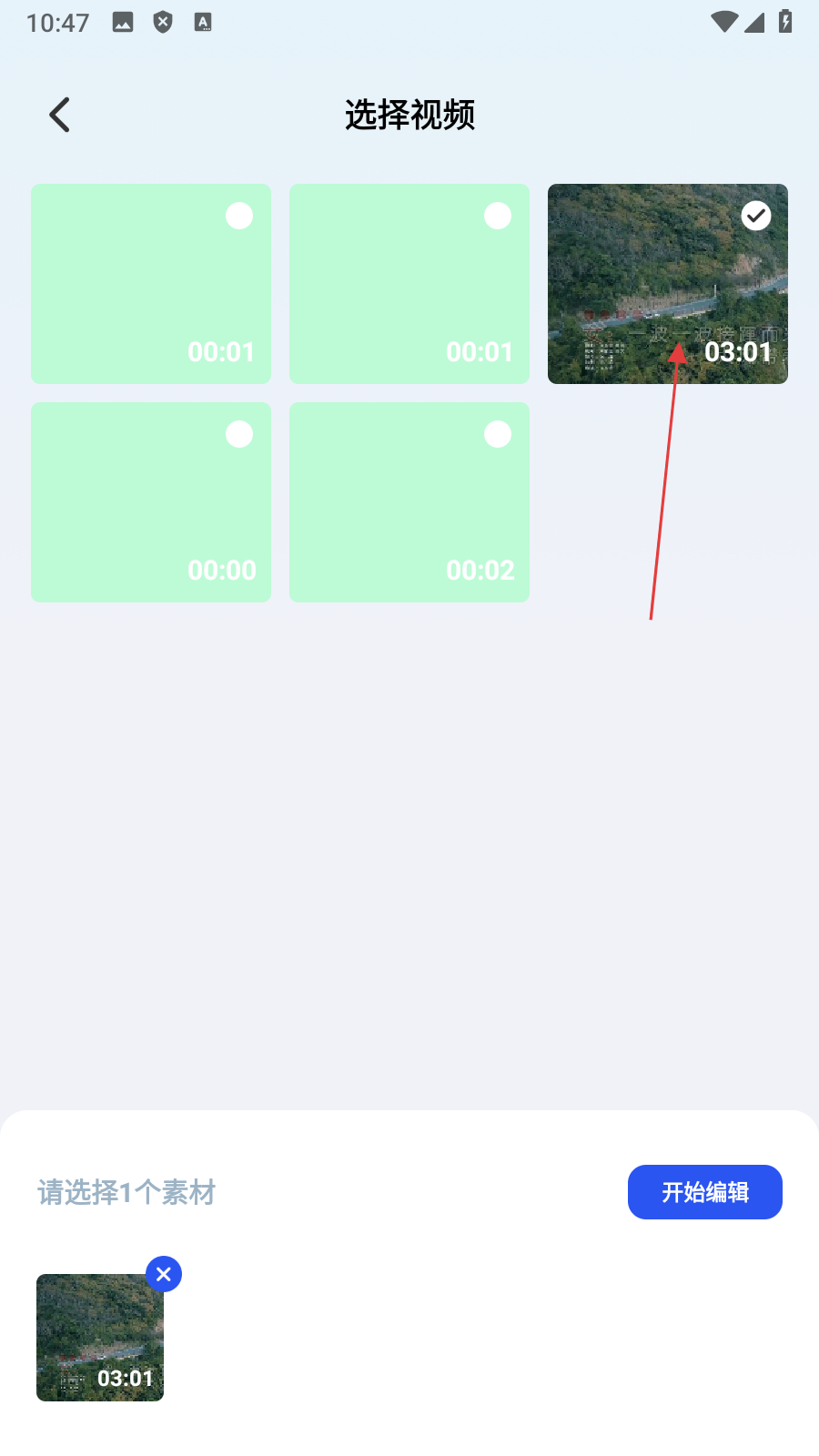 2、在选择视频页面,【选择视频】后点击【开始编辑】,进入视频拼接页面。