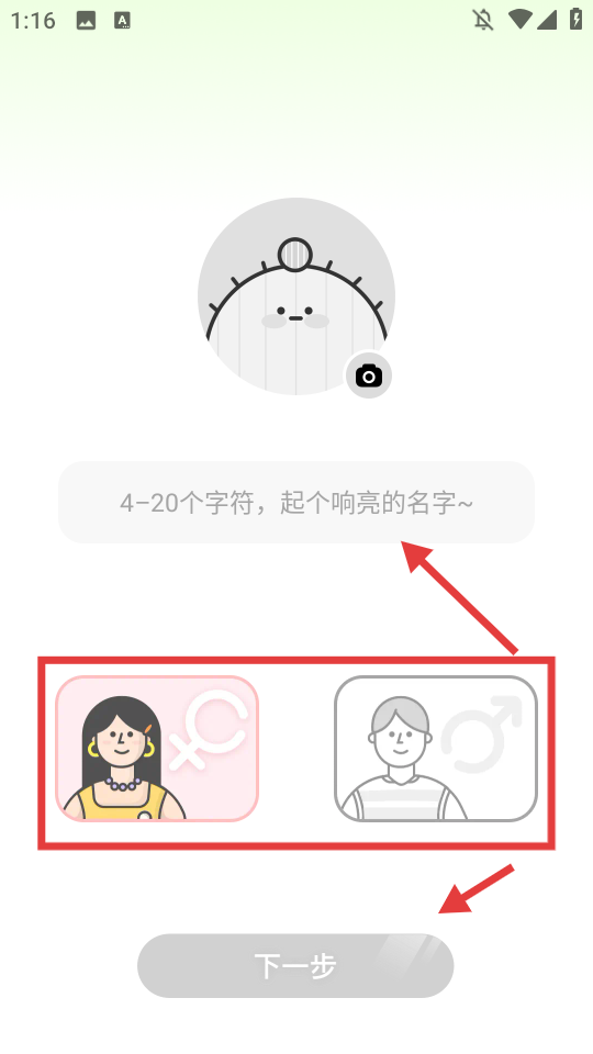 1、在注册界面,设置头像,输入4-20字符的昵称,选择性别后点击“下一步”。