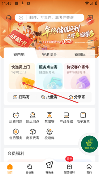 1、在邮政EMS首页点击【快递员上门】选项,进入寄快递的上门取件服务页面。