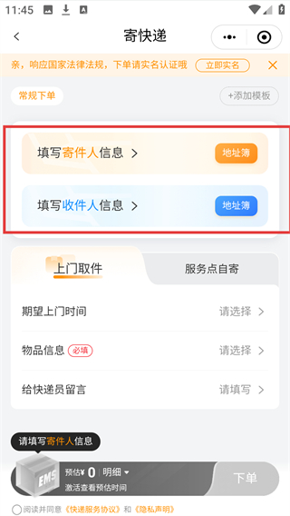 2、在寄快递页面填写【寄件人信息】和【收件人信息】,完善上门取件相关资料。