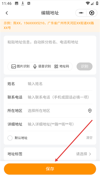 3、进入地址编辑页,填写【姓名】【联系电话】【所在地区】及【详细地址】等信息。