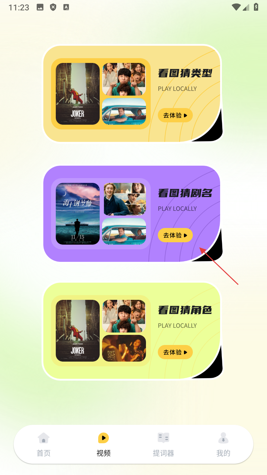 2、在视频页面点击【看图猜剧名的去体验】,进入看图猜剧名关卡页面。