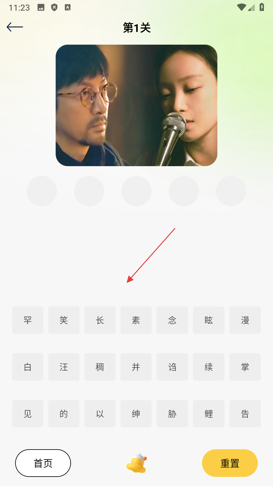 4、在第1关答题页面【选择正确文字】,即可完成看图猜剧名答题操作。