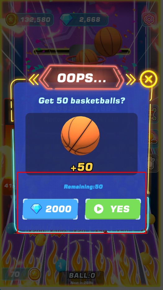 3、当篮球数量不足时,可选择花费钻石或观看广告等方式获取篮球。