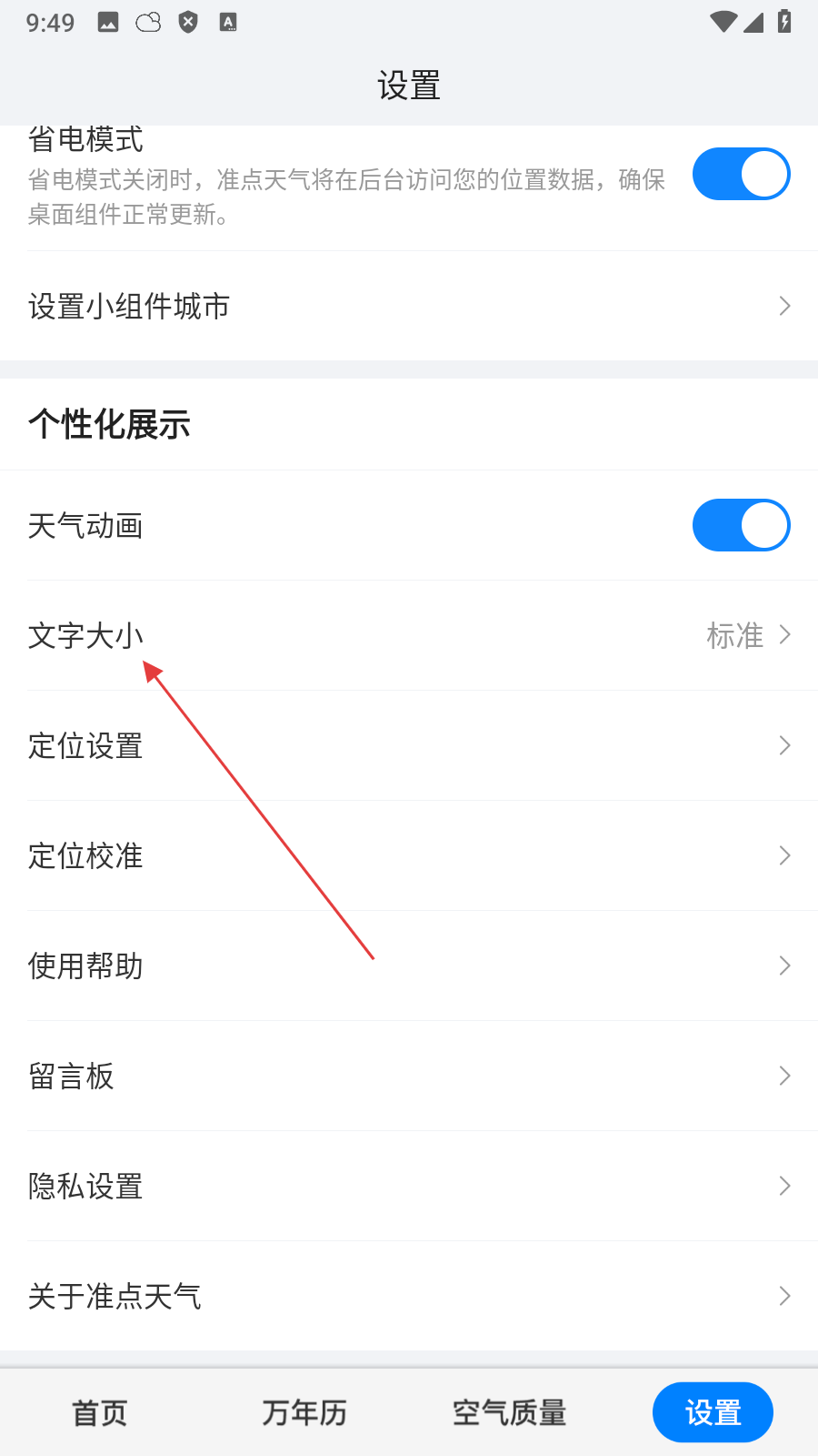 3、在设置页面点击【文字大小】,进入文字大小设置页面。