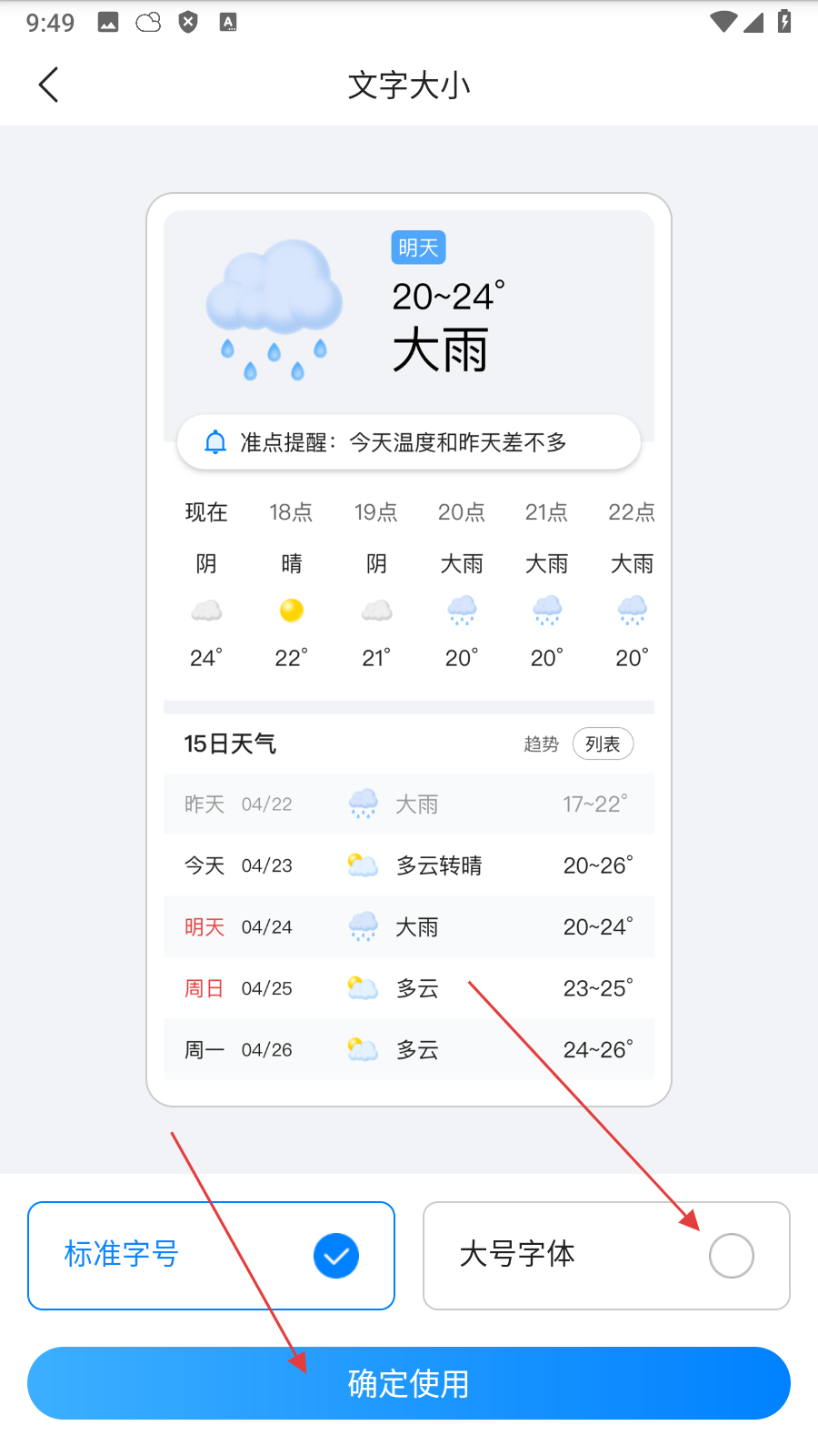 4、在文字大小设置页面,【选择字号】后点击【确定使用】,即可完成文字大小设置。