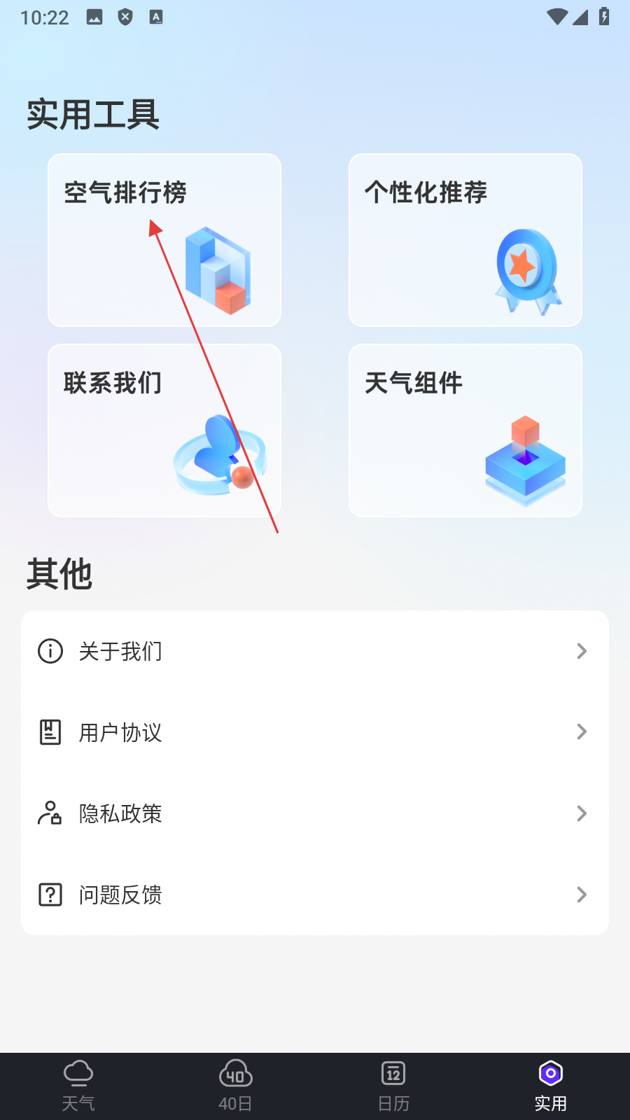 2、在实用工具页面,点击【空气排行榜】,进入全国空气质量排名页面。