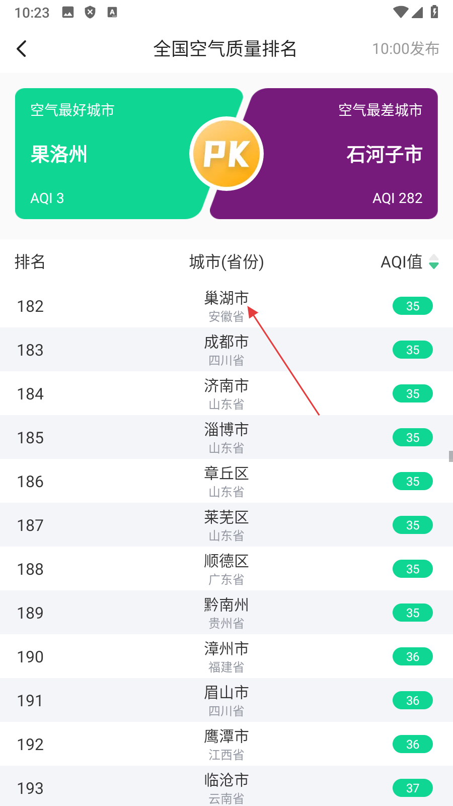 3、在全国空气质量排名页面,点击【目标城市】,进入该城市空气质量详情页面。