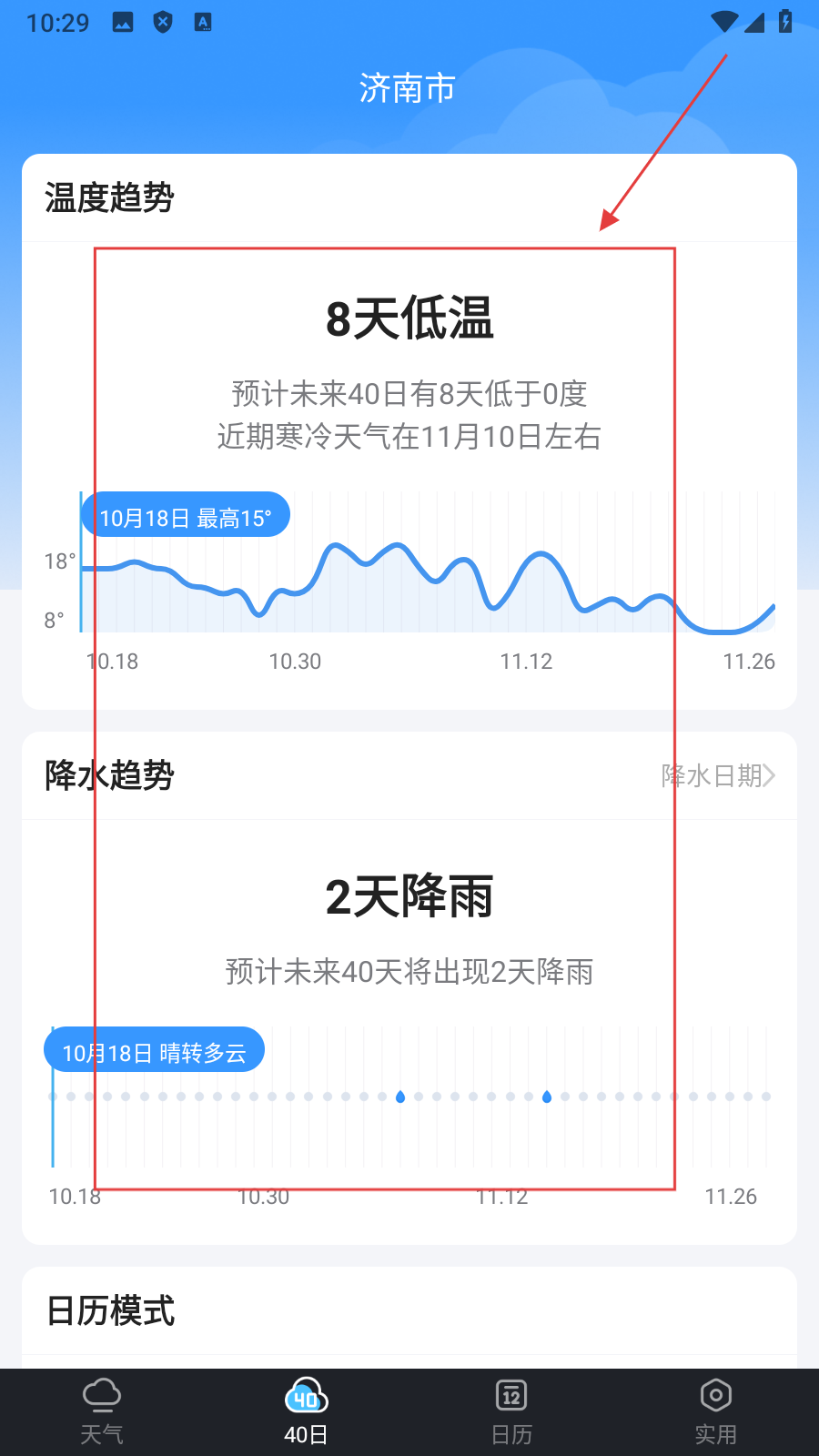 2、进入40日界面,可【查看温度趋势和降水趋势】,了解未来40日的低温和降雨情况。
