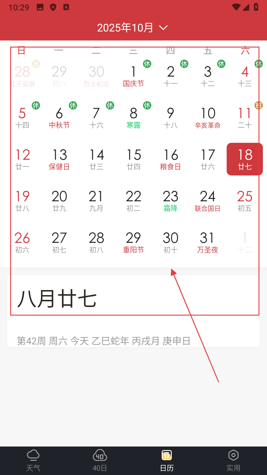 3、进入日历界面,可【查看2025年10月日历,了解节日、节气】等信息,掌握时间与传统历法内容。