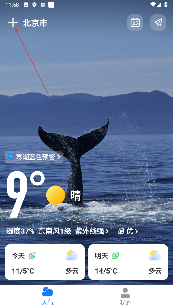 2、在城市管理页面,点击【右上角加号】,进入选择城市页面。