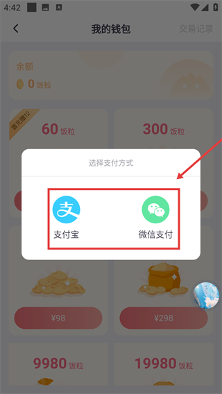 4、在支付方式选择界面中,选择【支付宝】或【微信支付】,完成饭粒充值的支付流程。