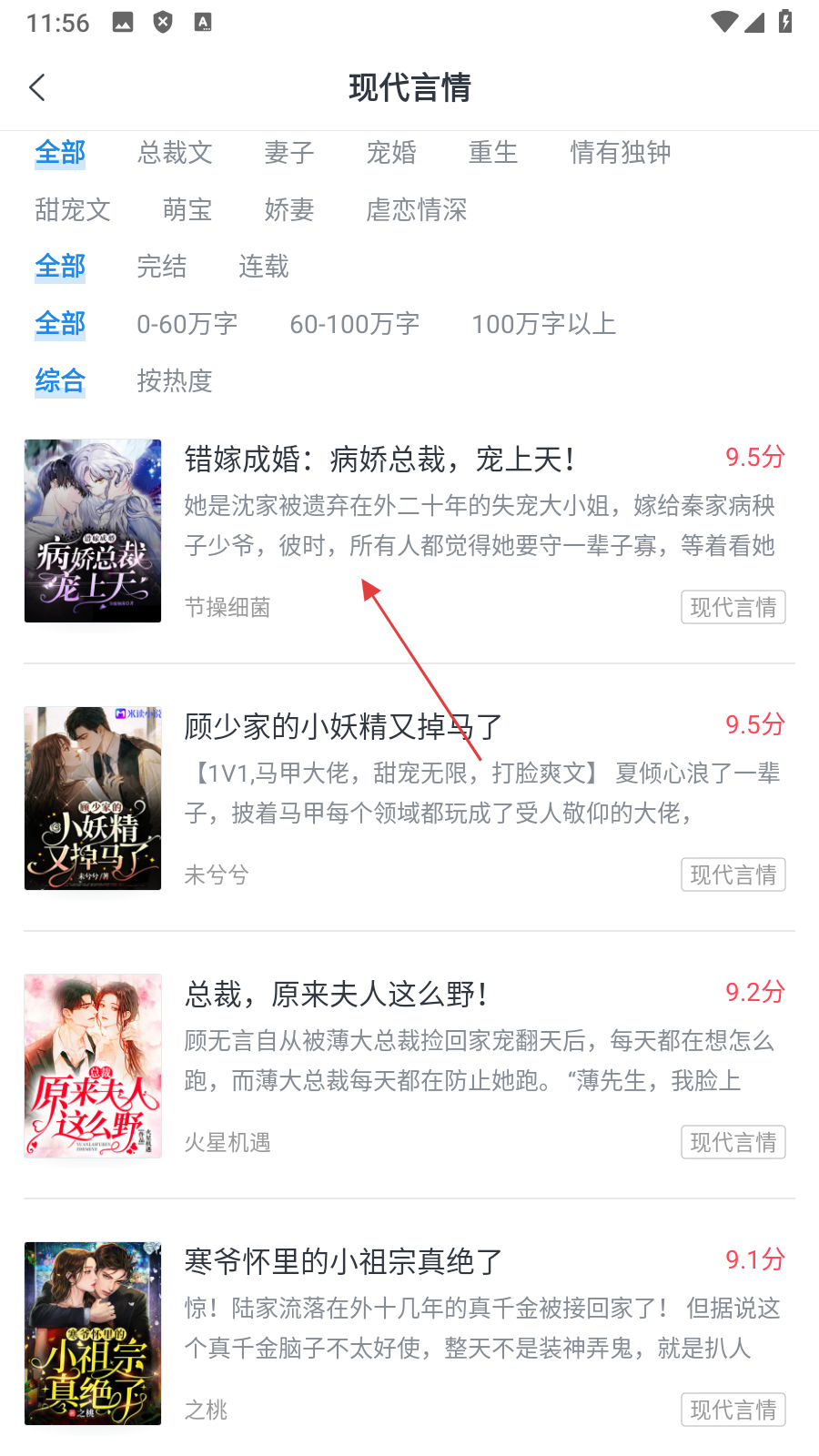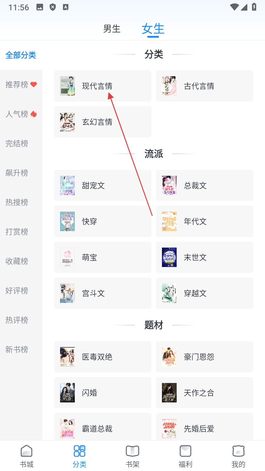 2、在分类页面点击【现代言情】,进入现代言情小说列表页面。