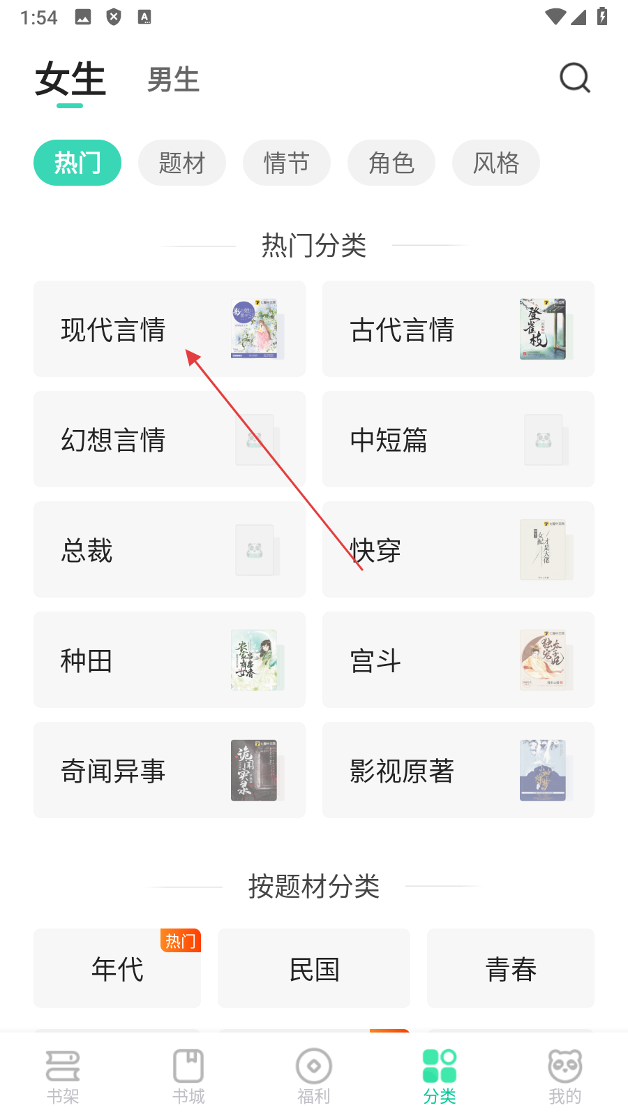 2、在分类页面点击【现代言情】,进入现代言情小说列表页面。
