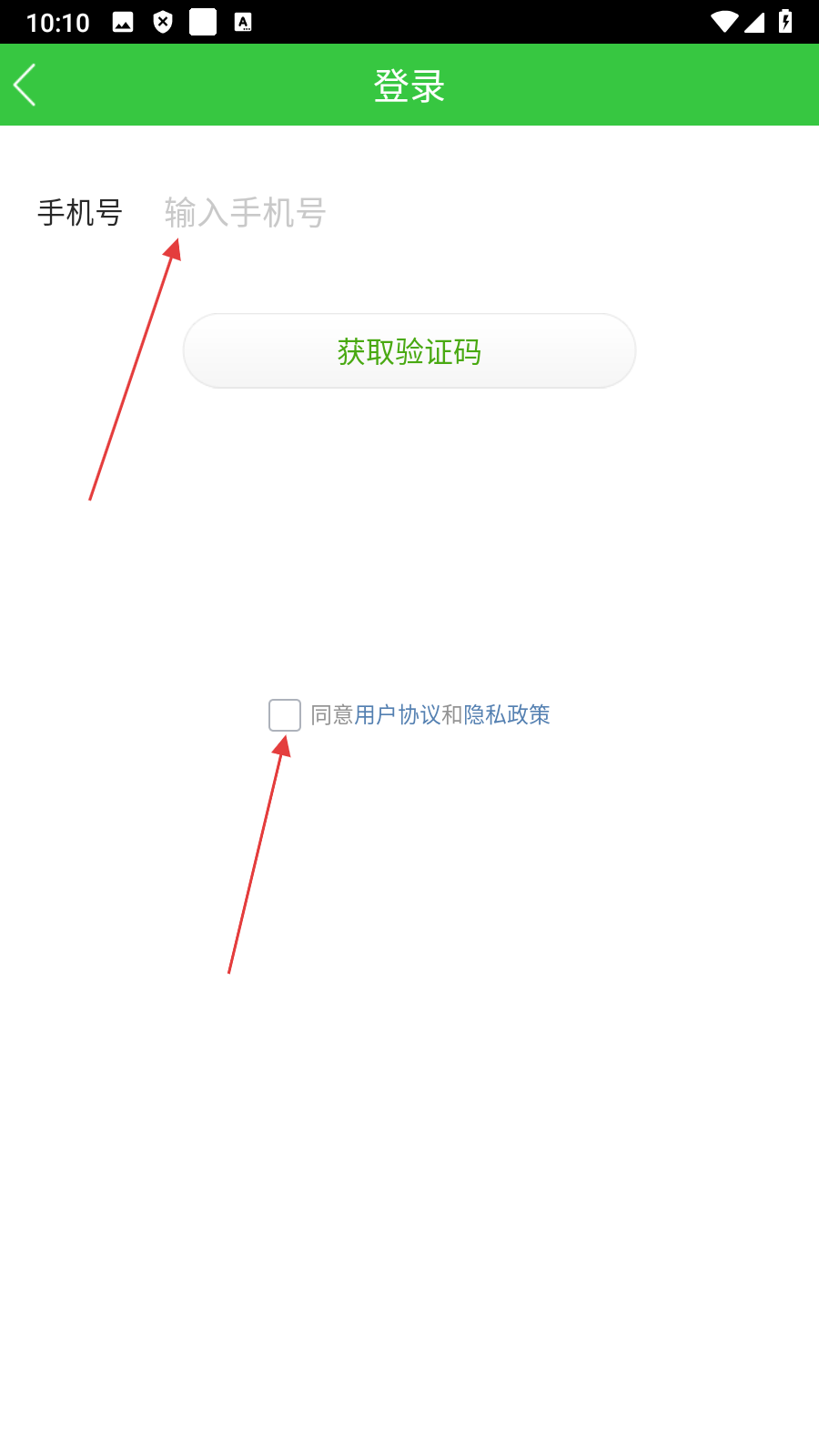 3、在登录页面,输入【手机号】并勾选【同意用户协议和隐私政策】。
