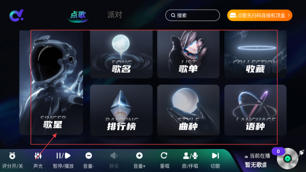 1、进入点歌界面,可通过【歌星、歌名】等分类点歌。