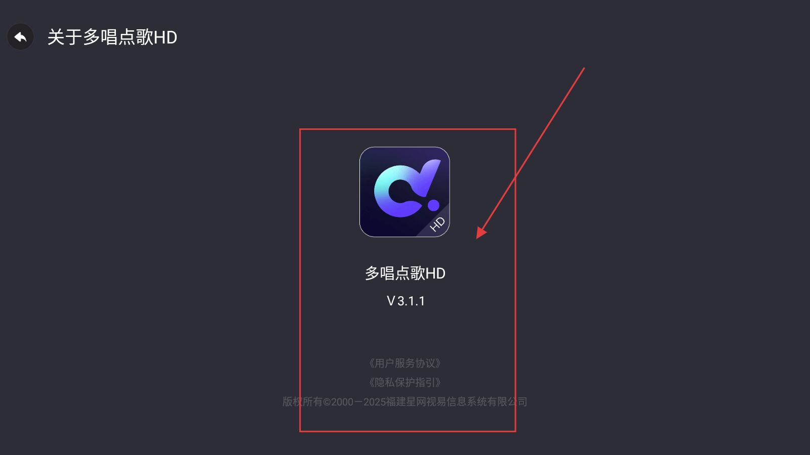 4、进入关于界面,可查看【多唱点歌HD的版本信息】,了解协议隐私保护等,掌握应用相关信息。