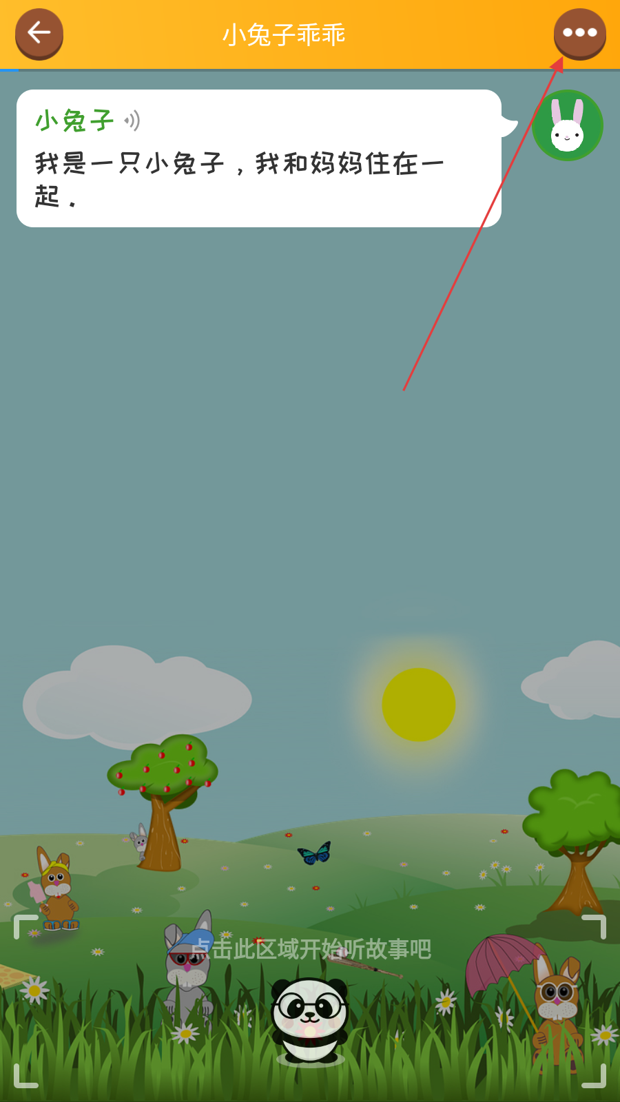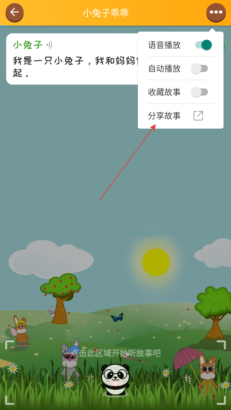 3、在故事阅读页面,点击【右上角功能按钮】,弹出功能菜单。