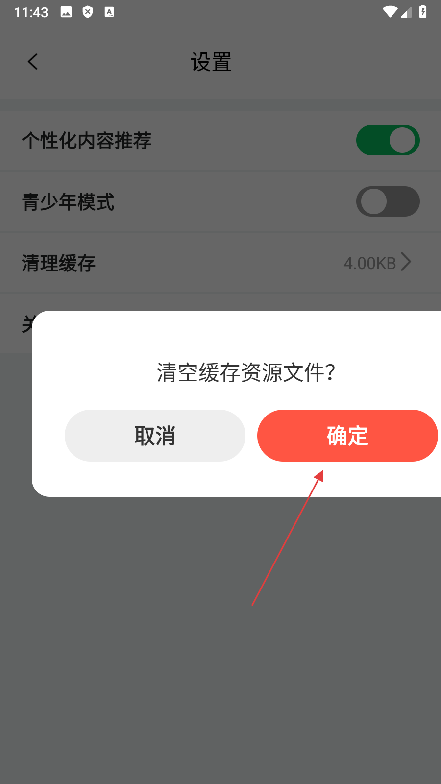 3、在设置页面点击【清理缓存】,弹出清空缓存资源文件确认框。