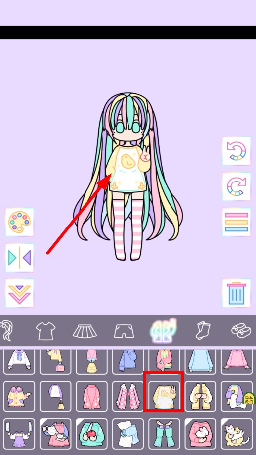 3、接着挑选带小鸭图案的黄色上衣,搭配长袜,丰富角色上装造型。