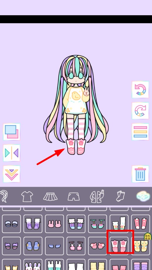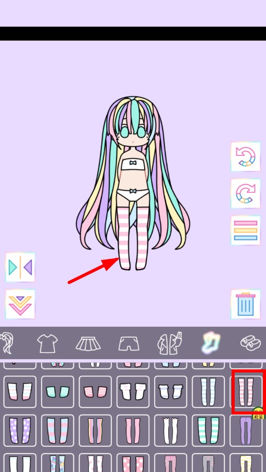 2、在袜子栏,选择粉白条纹长袜,为角色换上,打造甜美腿部搭配。