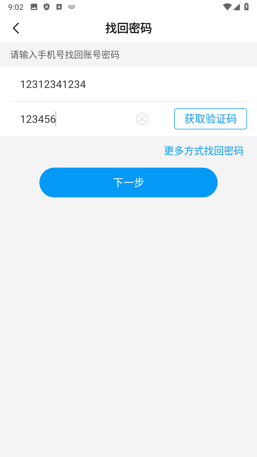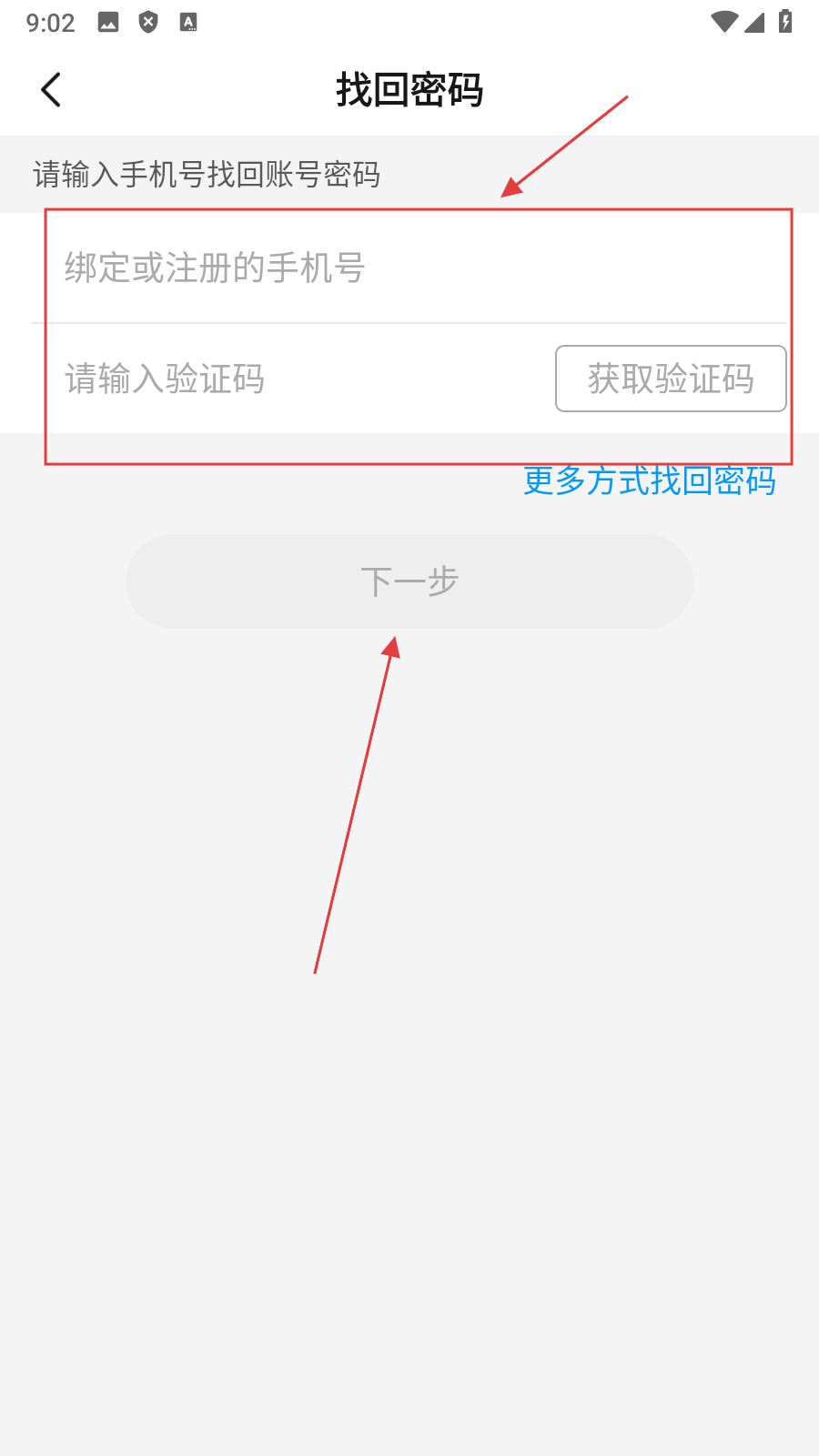 3、在找回密码页面输入【手机号、验证码】,准备下一步操作。