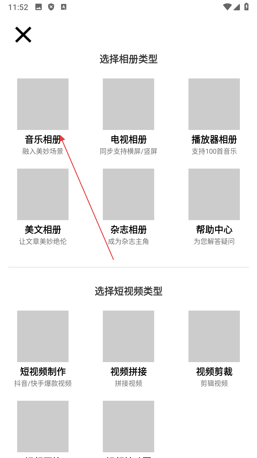2、在选择相册类型页面,点击【音乐相册】,进入音乐相册模板库页面。
