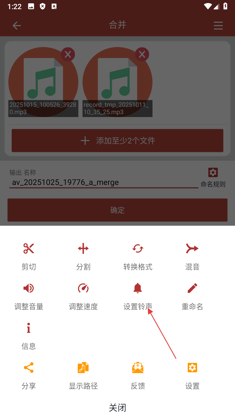 4、在功能选择框,点击【设置铃声】,即可完成音频合并后的铃声设置操作。