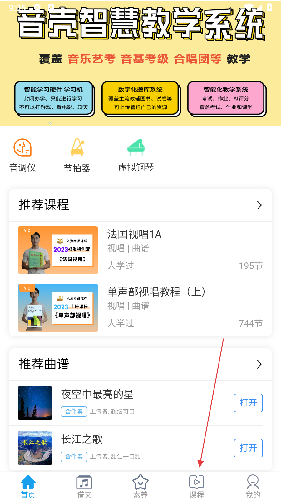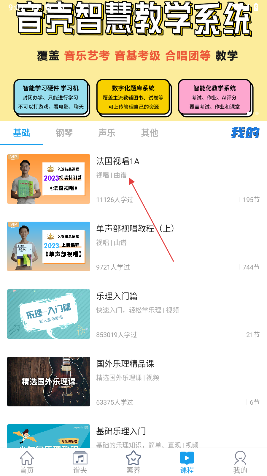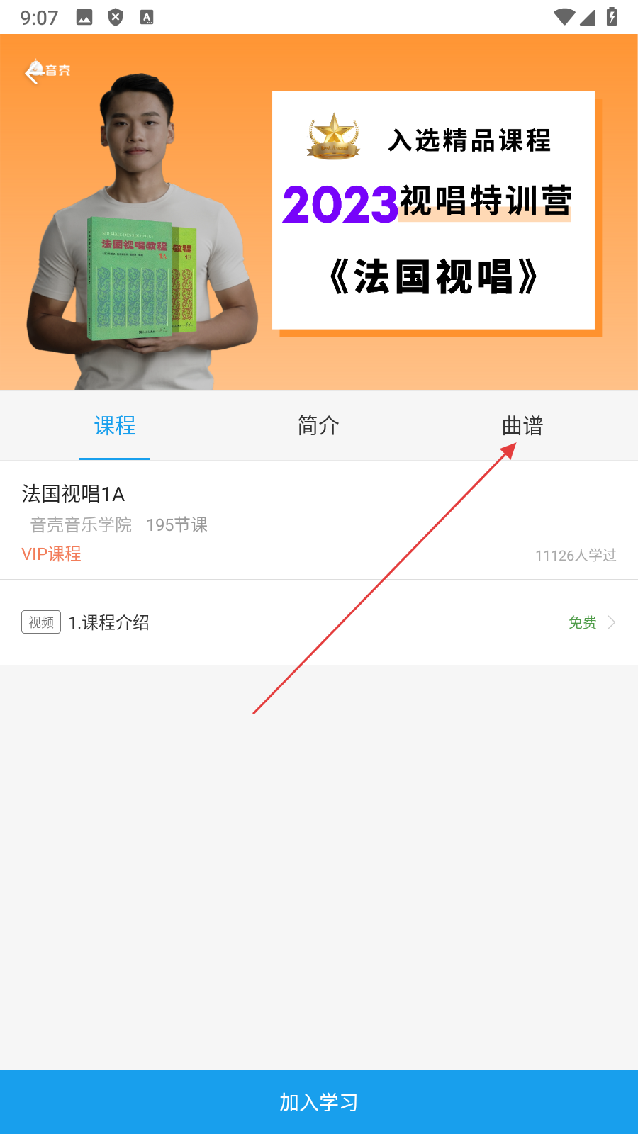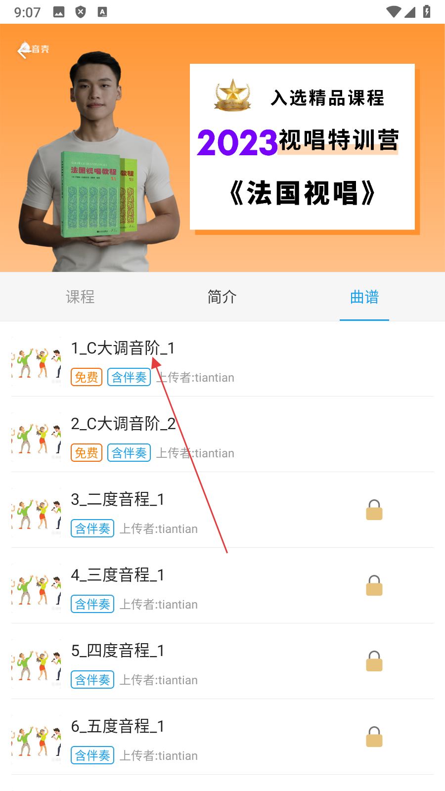 3、在课程详情页面,点击【曲谱】,进入曲谱列表页面。