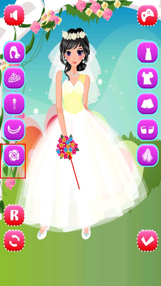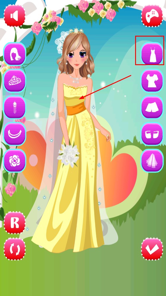 1、进入迷人公主新娘换装游戏,在右侧服装栏随机选择礼服,点击为角色更换礼服。