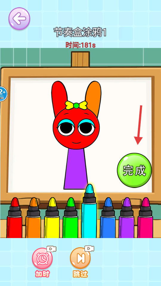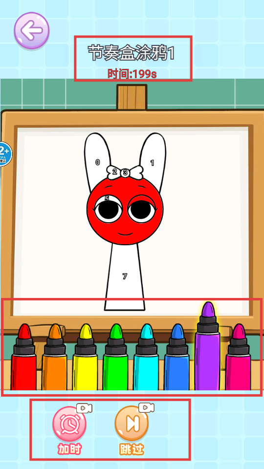 2、在【节奏盒涂鸦-1】关卡中,根据图案上的数字选择对应颜色蜡笔涂色。