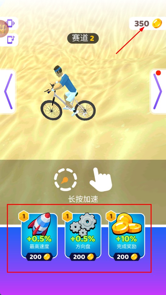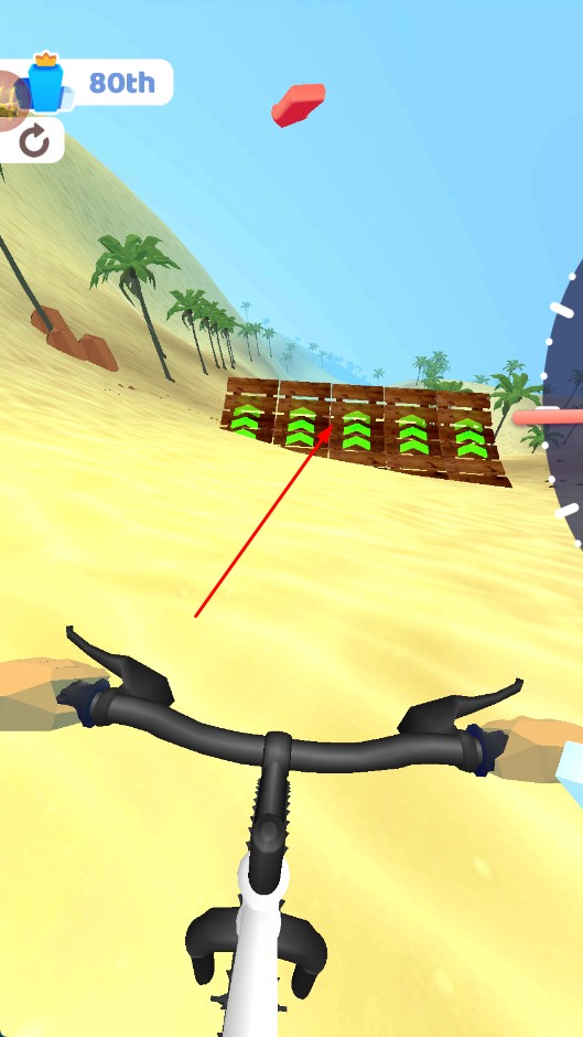 2、骑行时,长按可加速,遇到带绿色箭头的加速板,驾驶自行车通过,获取加速效果。