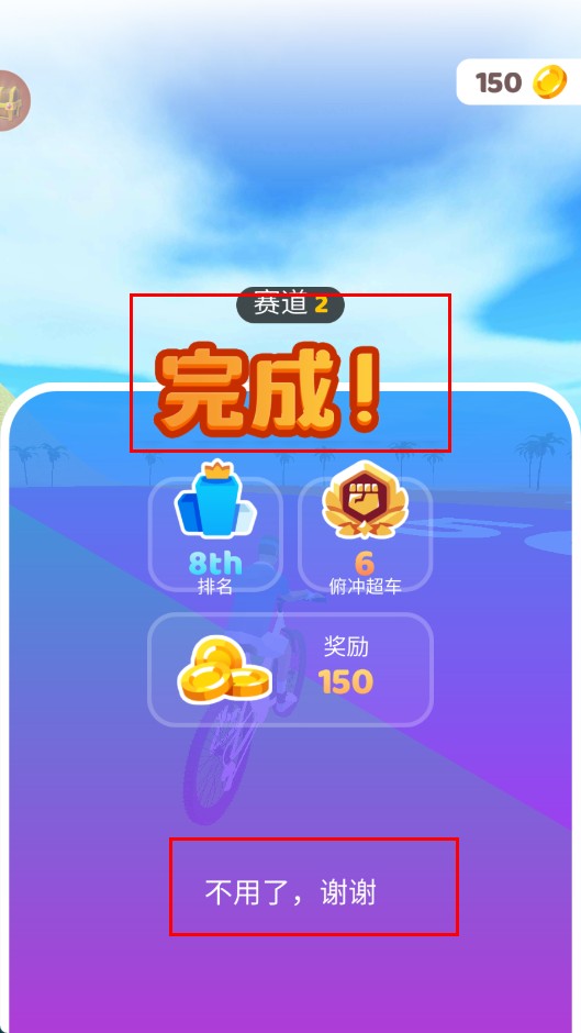 4、完成赛道2后,将获得排名、超车数等结算信息,以及150金币奖励,可点击“不用了,谢谢”结束本轮。
