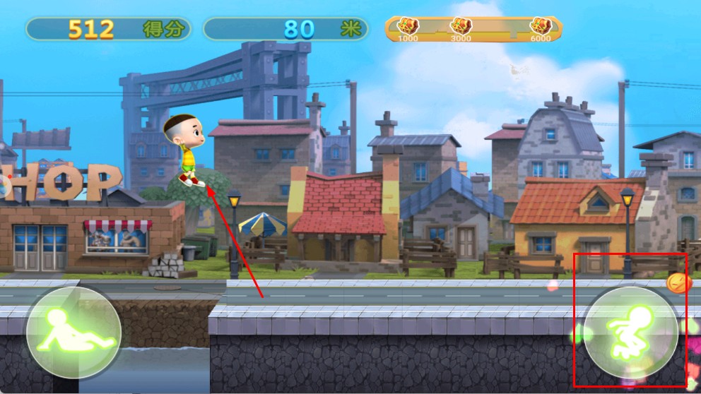 3、操控角色时,点击右侧跳跃按钮,让角色跳跃,避开障碍。