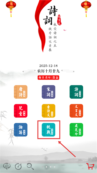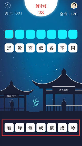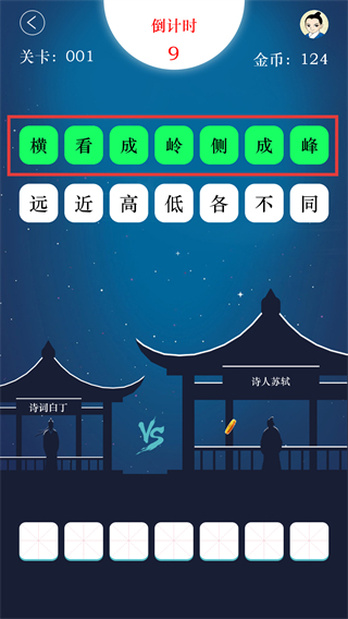 2、进入挑战后,底部有文字块,需将这些文字块组成对应诗句来推进关卡。