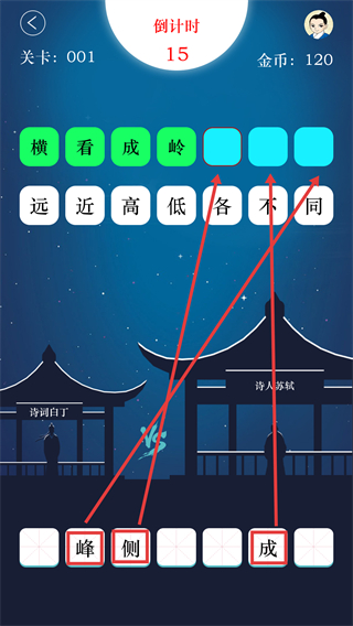 3、在挑战过程中,将底部的【峰】【側】【成】等文字块拖至上方空格处,完成诗句的部分拼接,逐步完成关卡要求。