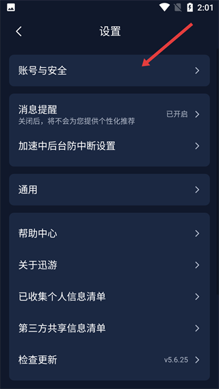 2、选择“账号与安全”选项,进入账号安全相关操作页面。