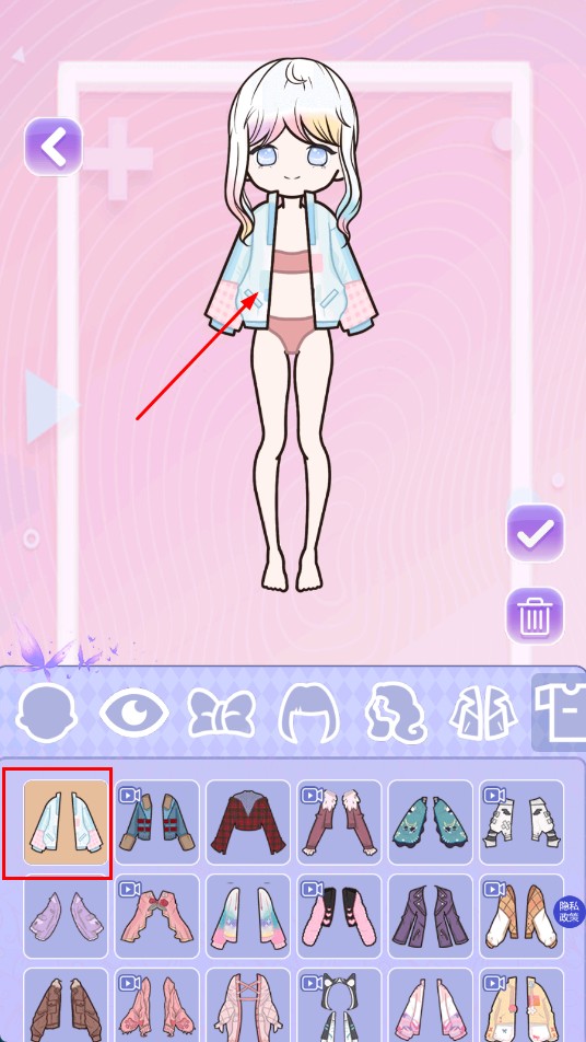1、进入【魔法公主装扮舞会】游戏界面,在服饰栏选浅蓝拼色外套,为角色穿上,打造清新风格基础。
