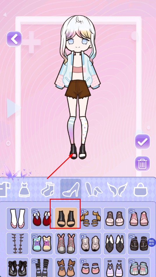 4、最后选黑色露趾鞋,为角色穿上,完成整套时尚休闲装扮。