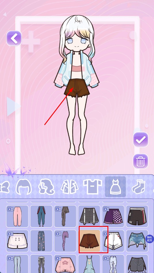 2、切换到下装分类,挑选棕色短裤,搭配已穿的浅蓝拼色外套,丰富造型。
