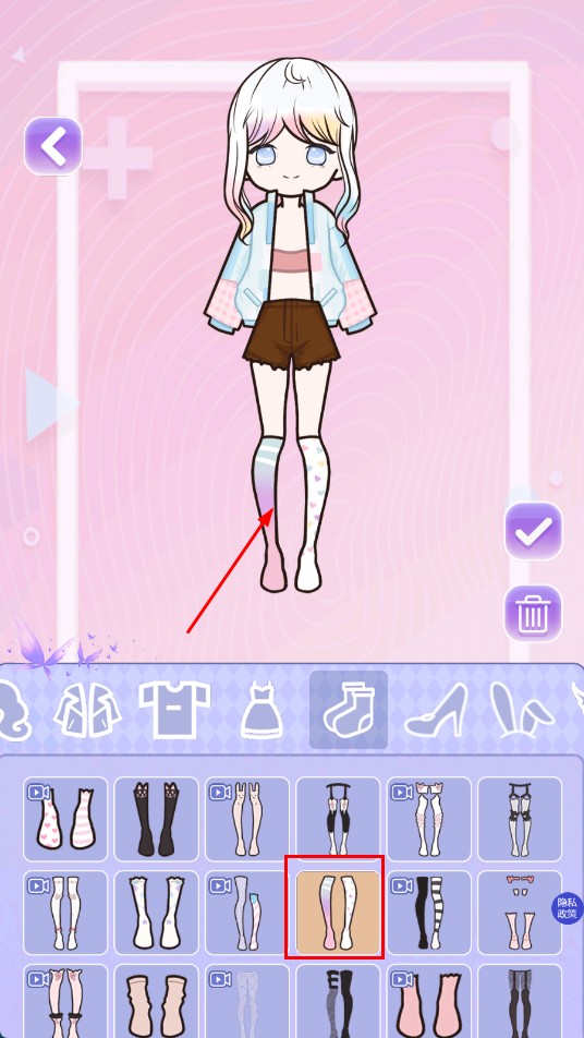 3、选带有渐变和图案的长袜,为角色穿上,完善下半身穿搭细节。