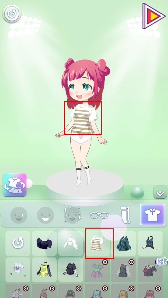 2、在服饰栏选条纹上衣,为角色穿上,打造基础穿搭。