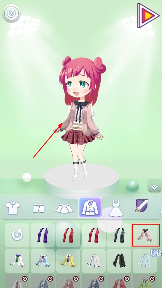 4、最后选粉色开衫,为角色穿上,完成整套甜美校园风装扮。