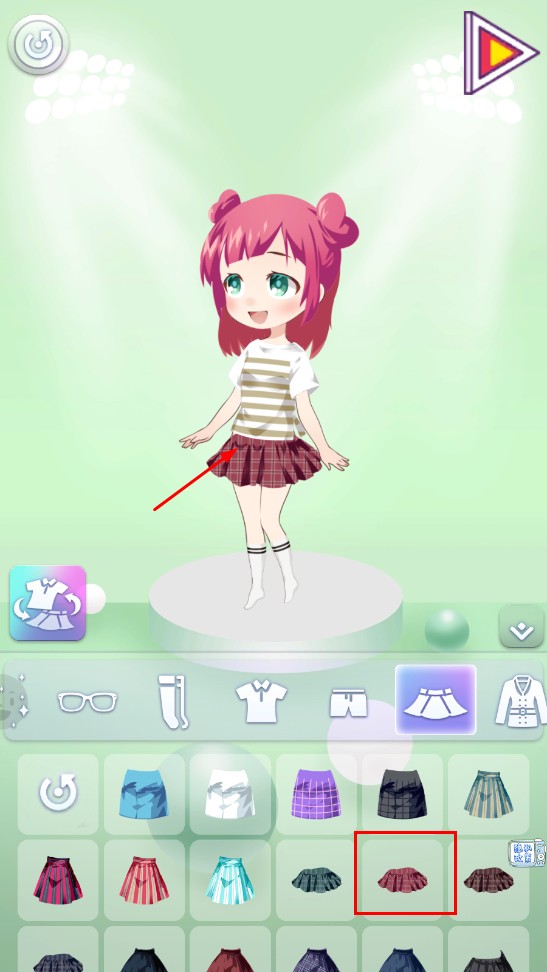 3、切换到裙子分类,挑选红格短裙,搭配条纹上衣,丰富造型。