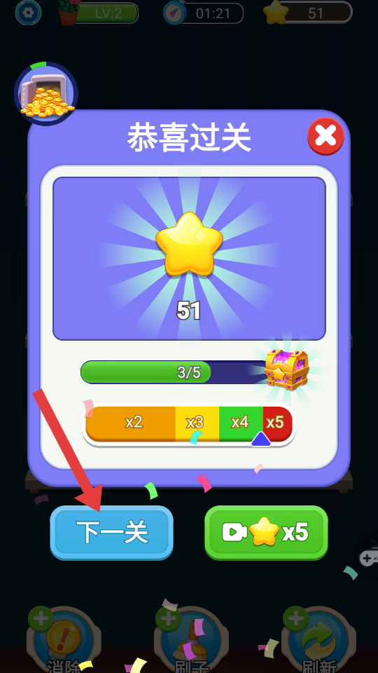 4、成功过关后,点击【下一关】按钮,继续挑战新关卡。
